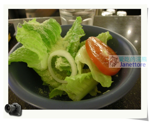 很簡單,生菜、洋蔥、蕃茄再淋上油醋醬撒上起士粉,