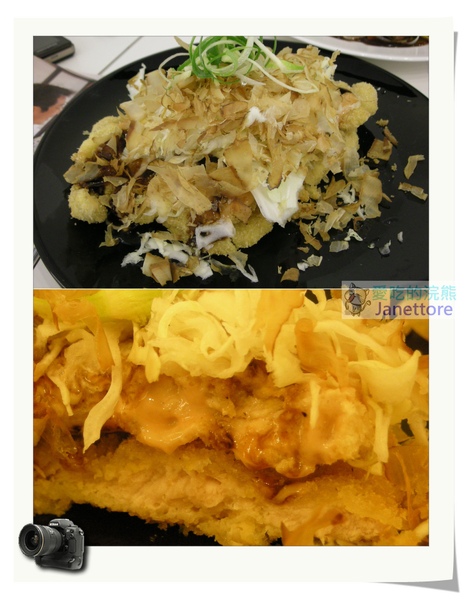 上面那塊可以用大阪燒方式吃,下面的豬排可以沾附的3色醬