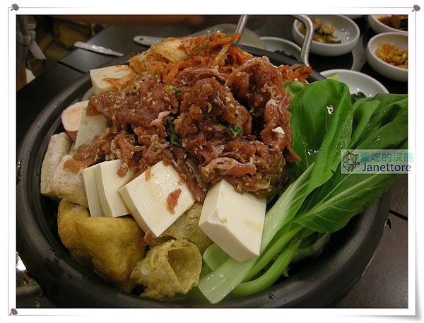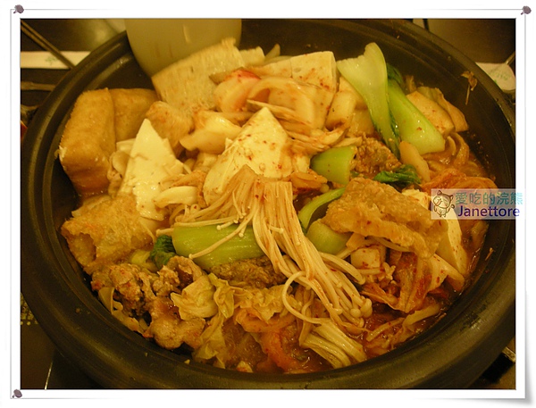 有三角油豆腐、火鍋豆腐、豆皮、青江菜、金針菇、牛肉、泡菜、