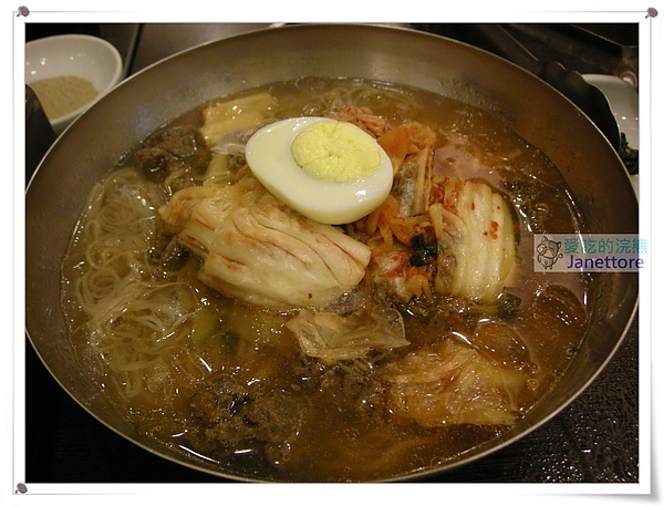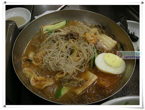 高湯裡加滿了冰塊,放上大量的泡菜,非常清爽,