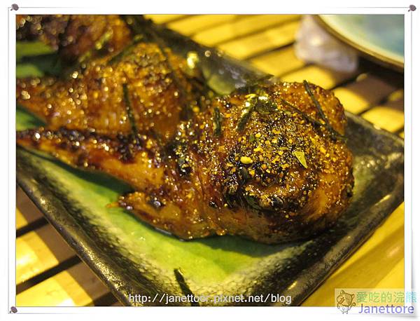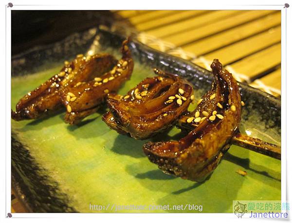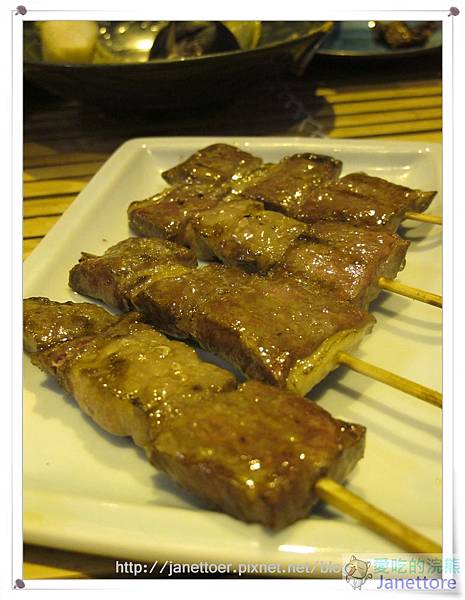 豚肉就是豬肉,用豬肉片將麻糬包附捲成串,外皮烤的出油帶脆感,麻糬軟化,