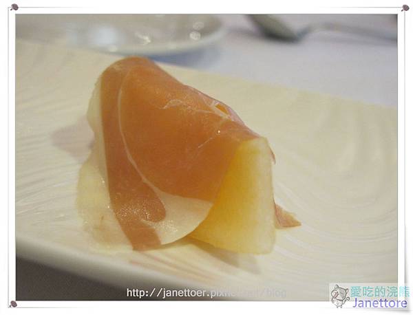 前菜:蘋果雞肉捲、伊比利火腿蜜瓜、洛神花鴨肝凍(由右至左)