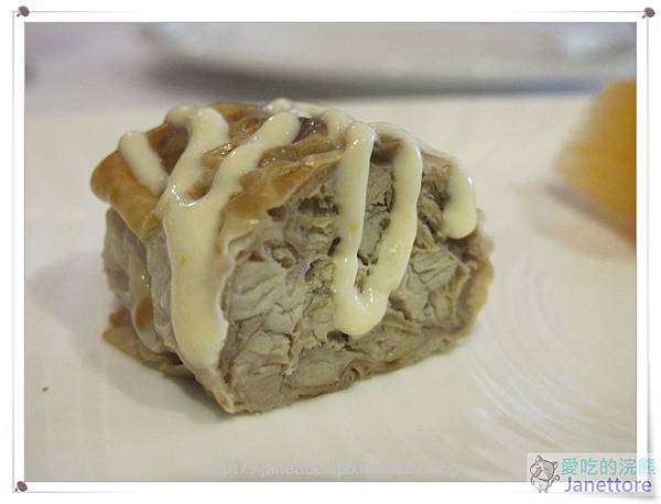 品嚐順序由左至右,蘋果雞肉捲口味較輕淡,較濃郁為鴨肝,口感較硬,不若鵝肝軟,