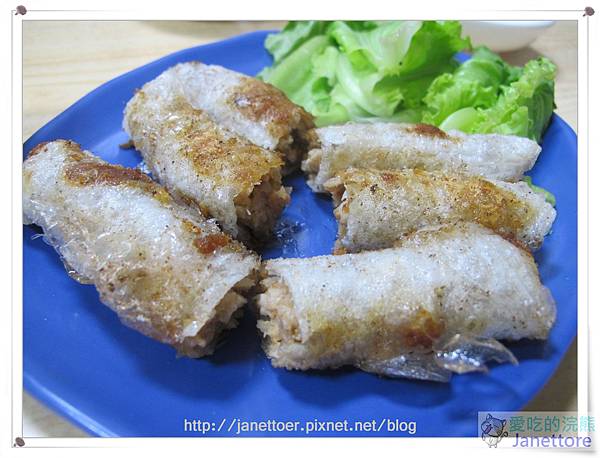 包著生菜一起吃比較不油膩,春捲皮炸的脆脆,切絲的芋頭、蝦米、肉末還帶有鬆且脆的口感。